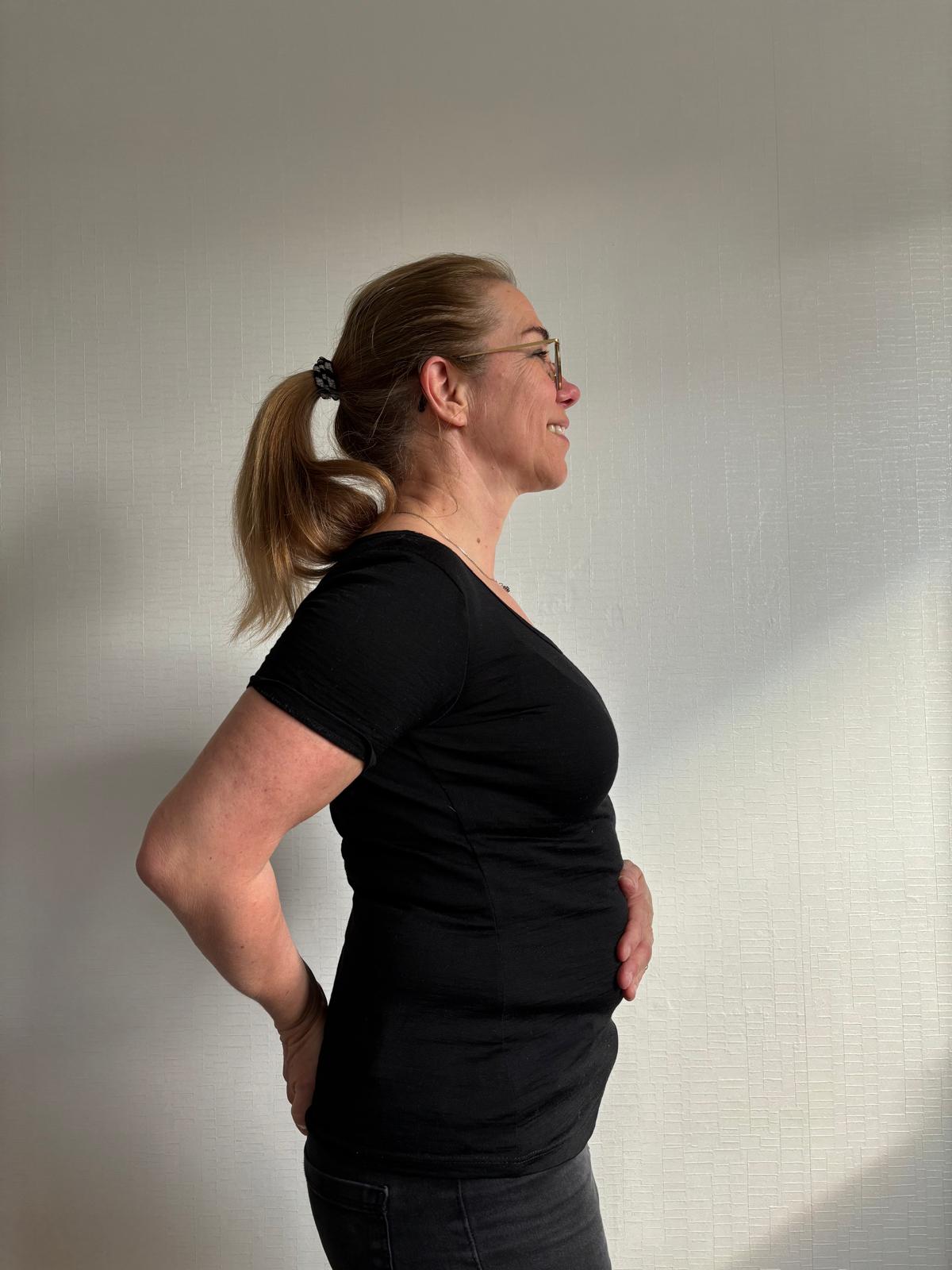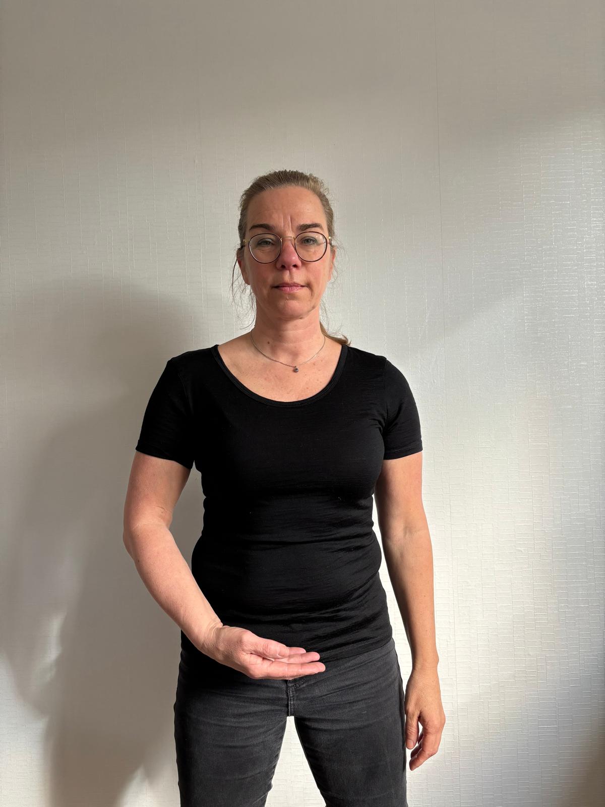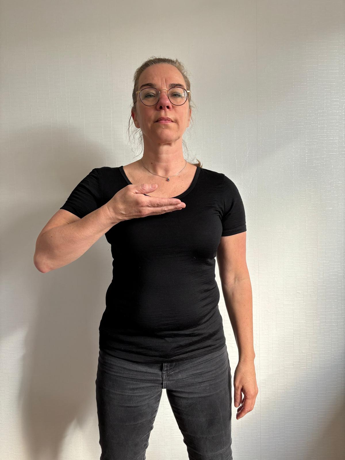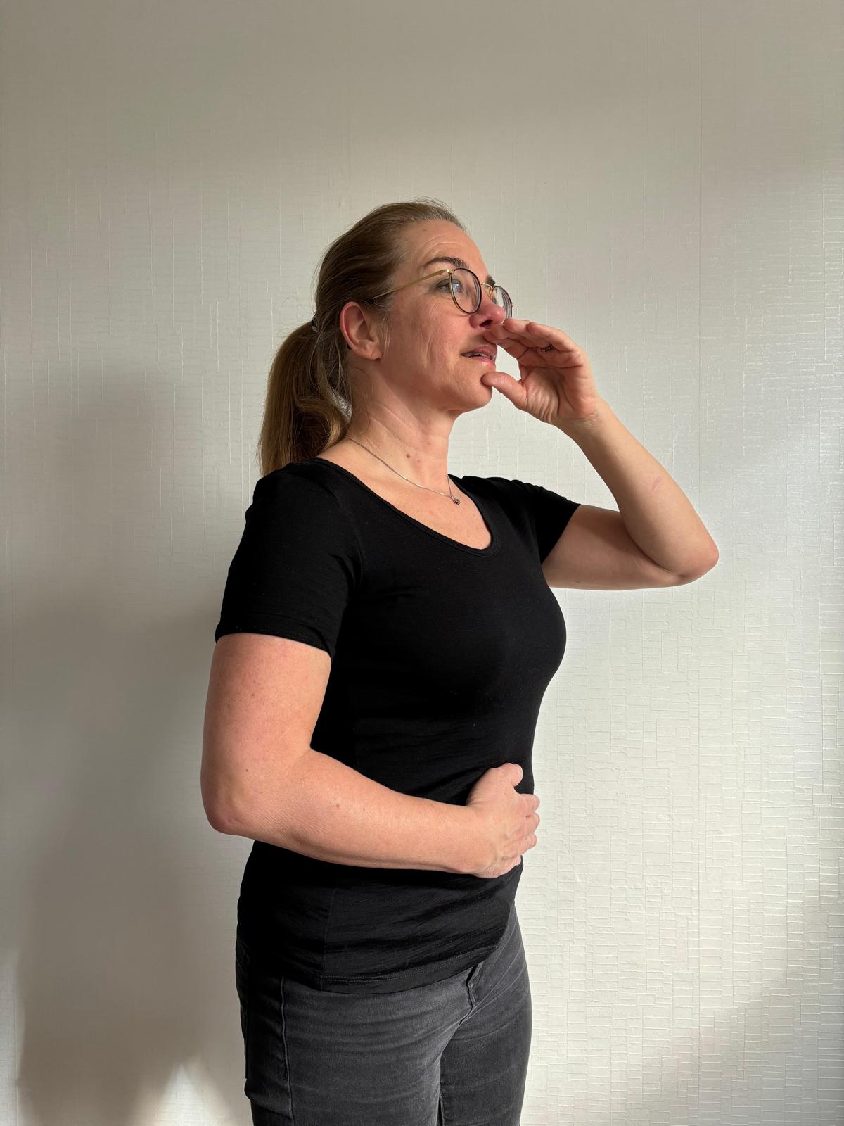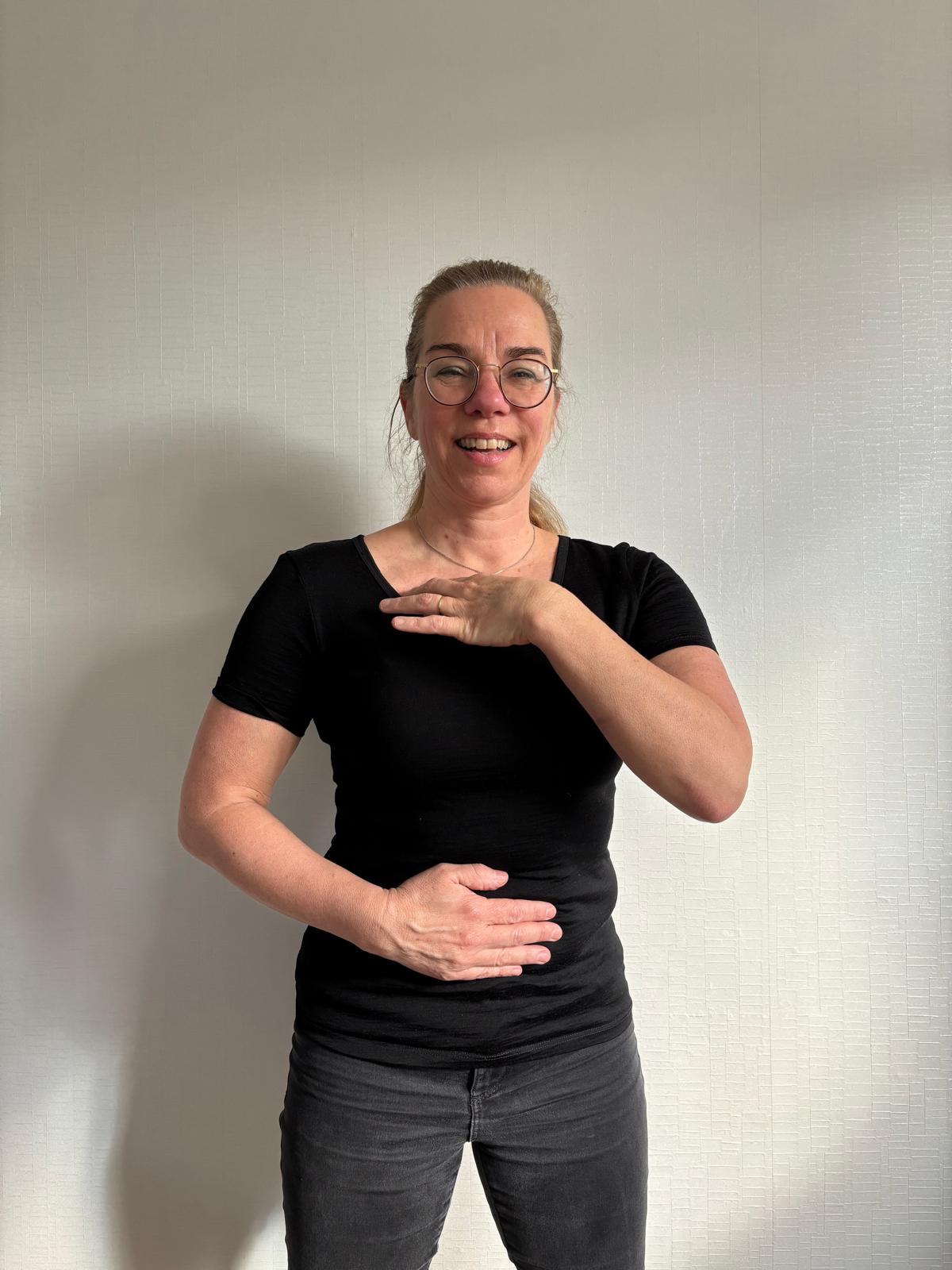 - Strek je armen, kruis ze, vouw je handen in elkaar en trek ze langs de borst omhoog.
