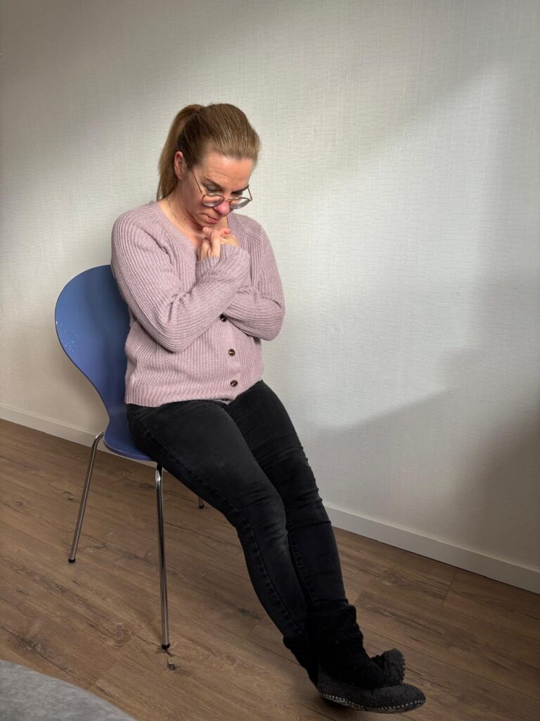 - Ga zitten of liggen (bij liggen buig ik mijn knieën en zet ik mijn voetzolen op de grond of de behandeltafel).